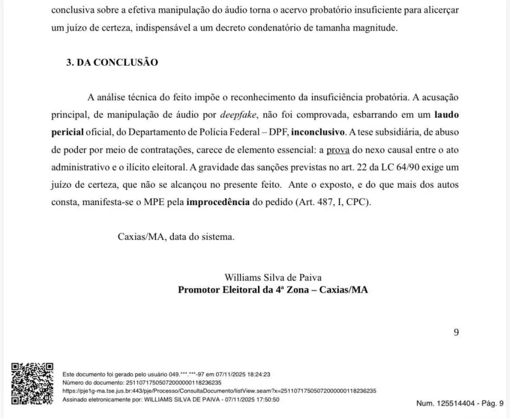 O Ministério Público Eleitoral concluiu que não há provas sobre o uso de deepfake nas eleições de Caxias. O parecer do promotor Williams Silva de Paiva recomenda a improcedência da ação movida por Paulo Marinho Júnior.