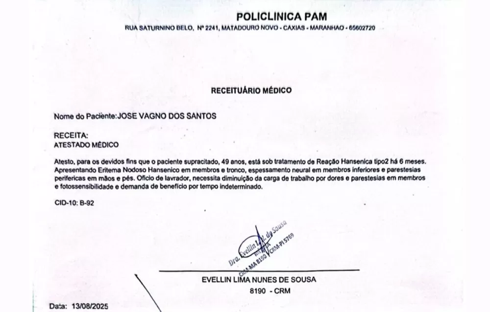 Atestado Médico (13/08/2025): Atesta que o Sr. José Vagno sofre de Reação Hansenica tipo 2, com "Eritema Nodoso Hansenico em membros e tronco, espessamento neural e parestesias periféricas", condições incompatíveis com trabalho de assessoria parlamentar, mas condizentes com atividades braçais.