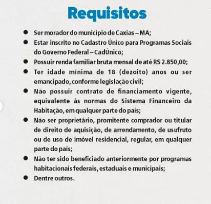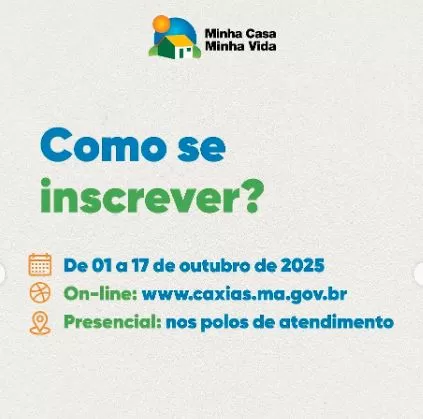 CAXIAS - MA - A Prefeitura de Caxias abre nesta quarta-feira (1º) as inscrições para o novo programa habitacional que vai distribuir moradias para famílias de baixa renda do município. As inscrições são totalmente gratuitas e seguem até o dia 17 de outubro, podendo ser feitas online ou presencialmente.