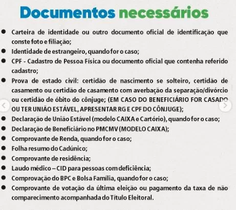Levar RG, CPF, comprovante de residência, comprovante de renda e documentação do CadÚnico. Casados devem apresentar também documentos do cônjuge.