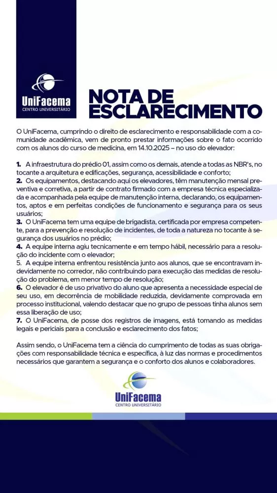 O Centro Universitário UniFacema, em Caxias, divulgou uma nota de esclarecimento após um incidente ocorrido no dia 14 de outubro de 2025, envolvendo alunos do curso de Medicina durante o uso de um dos elevadores da instituição.
