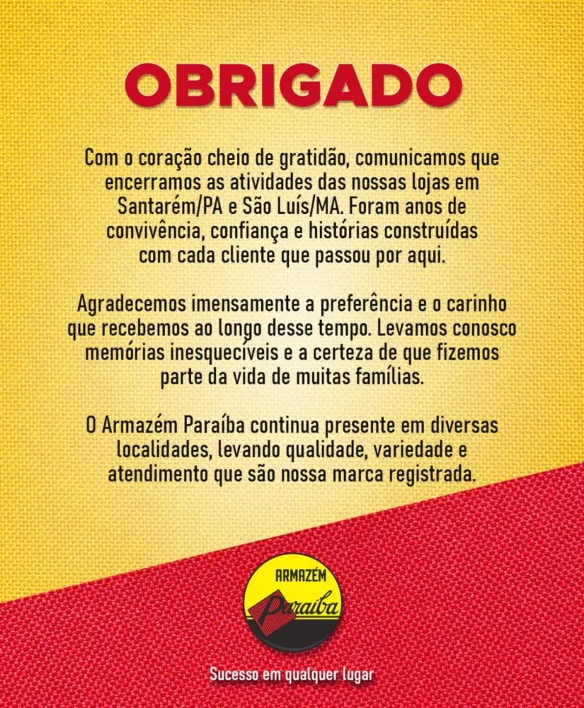 O Armazém Paraíba, uma das redes varejistas mais tradicionais do Norte e Nordeste, anunciou o fechamento de suas unidades em São Luís (MA) e Santarém (PA). A decisão, comunicada oficialmente nas redes sociais, marca o fim de operações em dois pontos estratégicos para a marca.