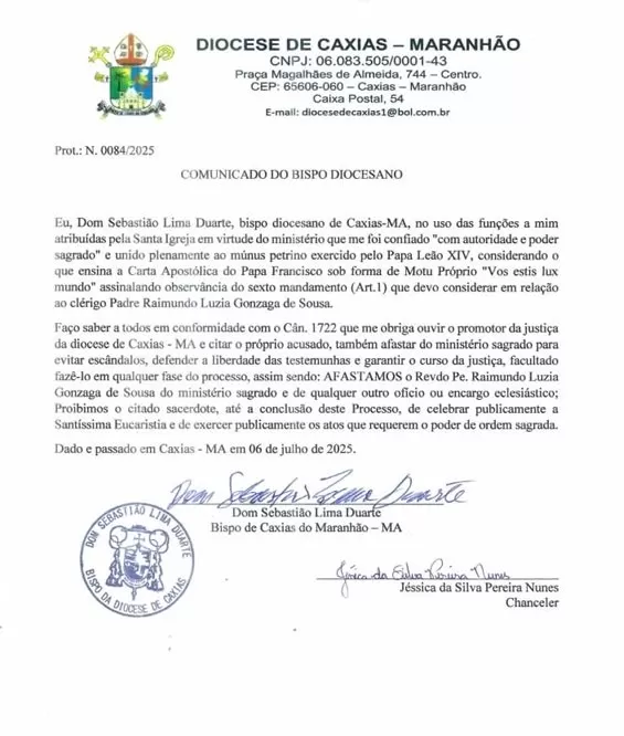 A Diocese de Caxias (MA) afastou o padre Raimundo Luzia de suas funções religiosas com base no Cânon 1722. A decisão ocorre em meio a suspeitas de abuso, ainda não confirmadas oficialmente.