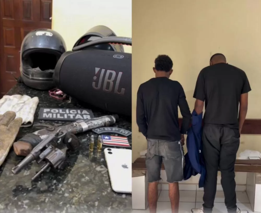 Dois suspeitos confessaram os crimes e foram encaminhados à delegacia; entre os itens apreendidos estão armas de fogo, uma motocicleta roubada e objetos pessoais das vítimas.