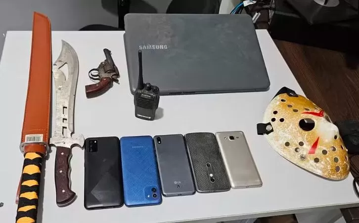 Operação conjunta da Polícia Civil e Federal encontrou arsenal incluindo revólver, espadas e equipamentos tecnológicos na residência do jovem.